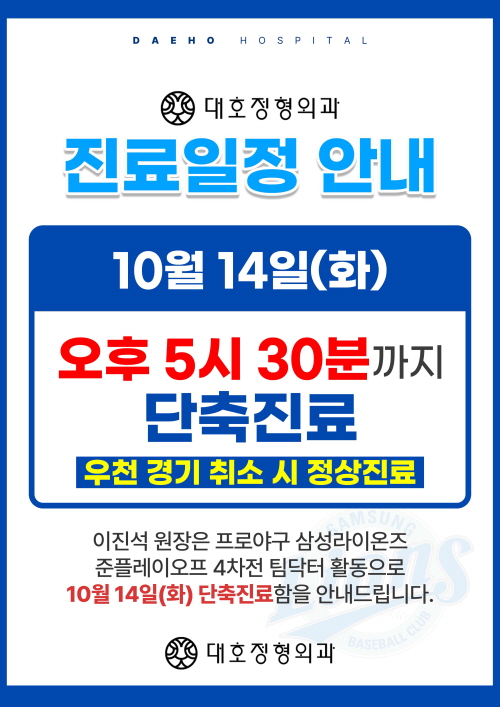대호정형외과 10월 14일 단축진료 안내